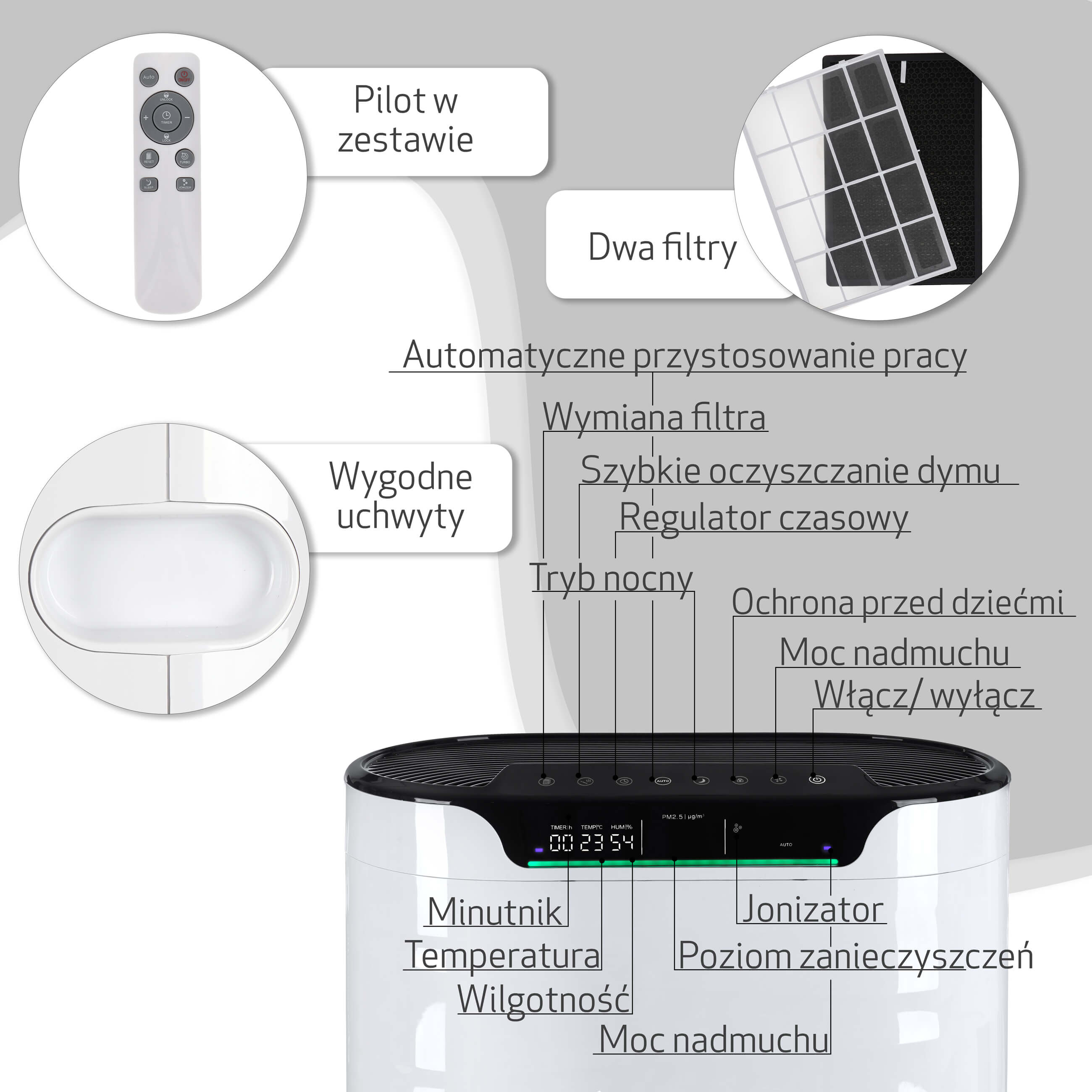 Do oczyszczacza dołączony jest pilot za pomocą, którego w komfortowy sposób można sterować pracą urządzenia siedząc wygodnie w fotelu.